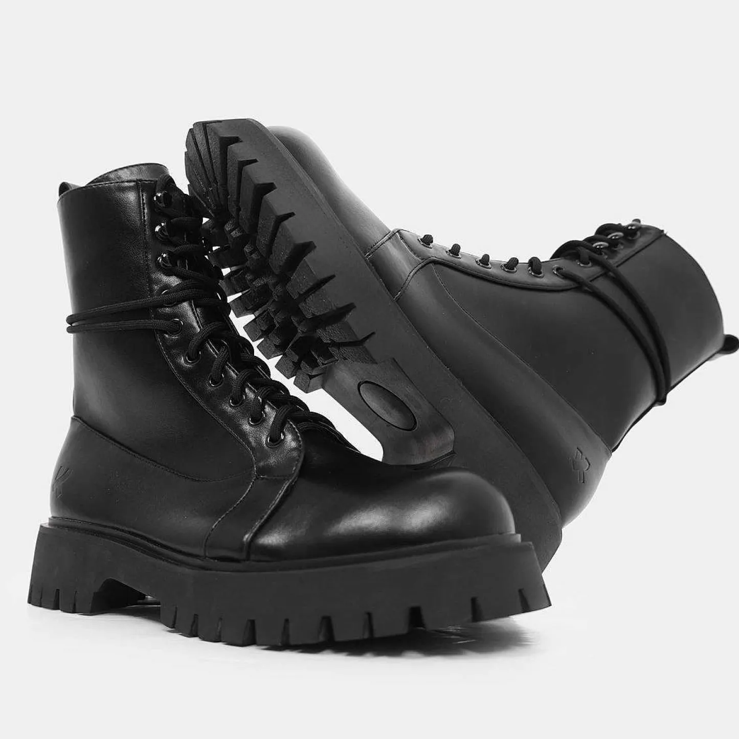 De Nieuwste Militaire Herenlaarzen Van Koi Footwear Zijn De Perfecte, Slimme En Toch Punkachtige Toevoeging Aan Je Garderobe. Een Klassieker Maar Met Een Unieke Twist – Deze Zwarte Veganistische Leren Veterlaarzen Hebben Een Dikke, Gekartelde Zool Als Subtiel Onconventioneel Kenmerk. Draag Deze Bikerlaarzen Voor Heren Naar Een Festival Deze Zomer Of Zelfs Naar Een Formele Gelegenheid.